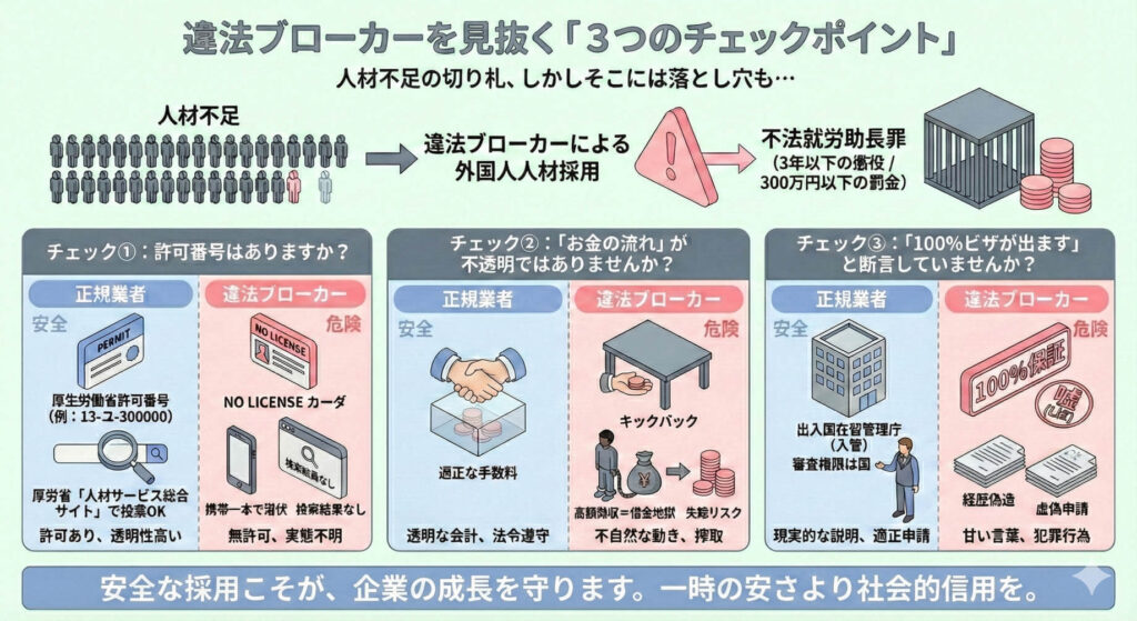 「手続きが面倒」「とにかく安く、頭数だけ揃えたい」 そうした経営者の焦りにつけ込むのが違法ブローカーの手口です。しかし、一時の安さや手軽さと引き換えに、企業としての社会的信用を失うリスクを冒すべきではありません。